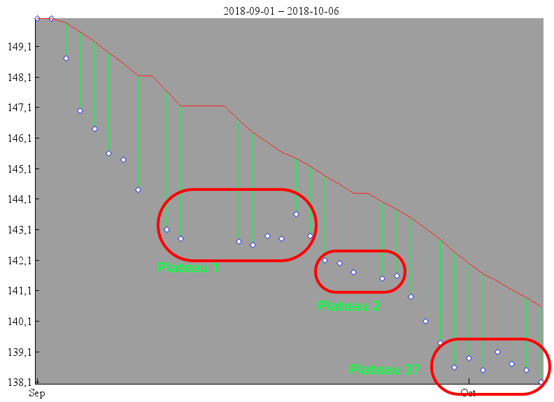Above is my all-time weight chart with a trend line. The trend always goes down at a steady pace. The section where it appears to be plateaued is simply the days I was not able to weight myself. Other than that, all good trend line going down.
