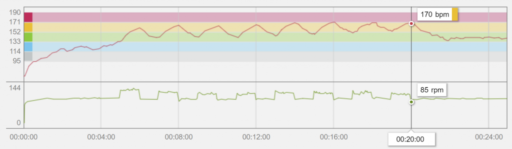 Above are the HR and indoor cycling cadence graphs of one of my HIIT sessions. You can see the spikes going between 160 and 170 bpm. My resting periods are between 140 and 155bpm. It does not matter if you increase your cadence as I did, or increase resistance; you just need to target the right heart rate zone.