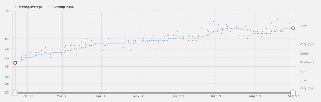 One interesting observation I have, and to be honest this is not unexpected, is that my Vo2Max has drastically improved. The way Polar measures it is through a custom metric they call “Running Index." It is not merely a measure of VO2Max; it is a combination of various variables to assess your running performance. Here is my chart since I started running in mid-January 2019. Moderate to Elite 👍
