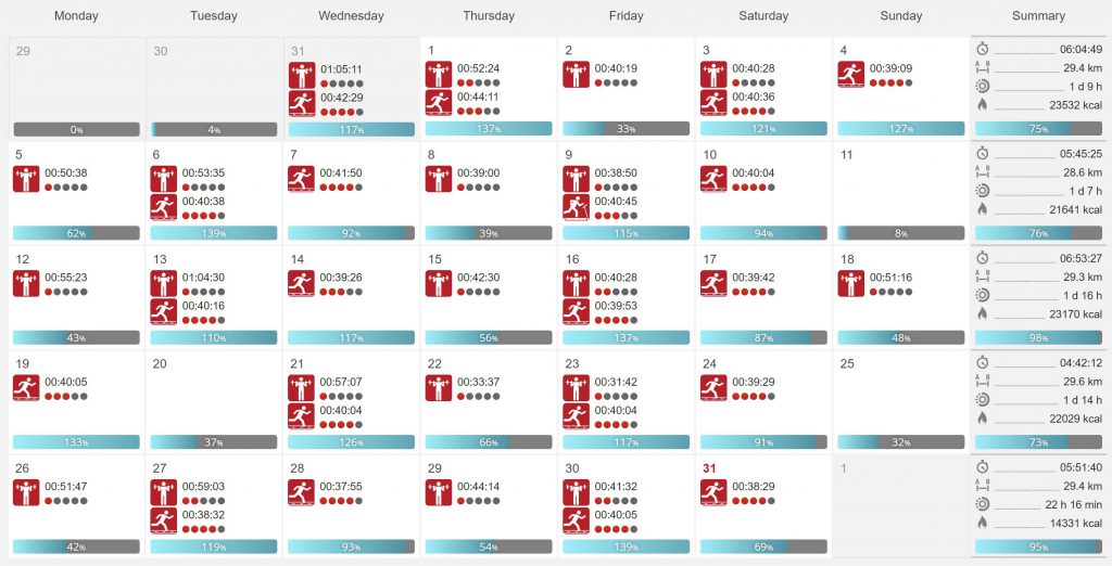My exercise plan was the same as the previous month; four days of weight training and four days of cardio mixed in a way that gives me a single day of full rest during the week. During the week of 19th, I had to slide back two sessions for day to provide me with the 20th as a free day. I had some business travel to take care of. That was pretty much the only exception I had to make for this month.