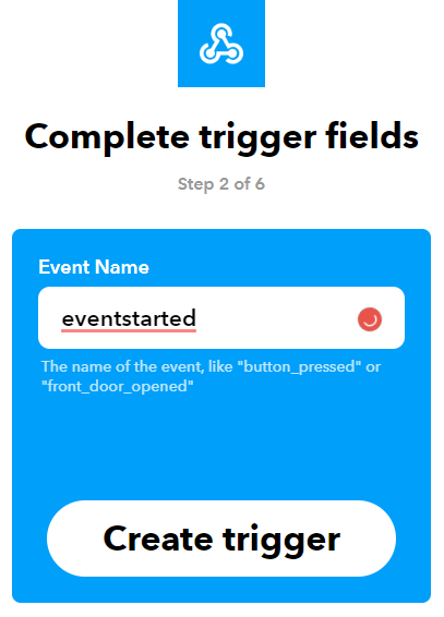 I started creating an applet on IFTTT. When you are creating a webhook definition as a trigger on IFTTT, an event name is required. I created two separate webhooks for turning the lights on and off. I used event names eventstarted and eventfinished.