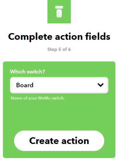 The action for the applet on IFTTT will be the Wemo integration. The only item on this step is to select the right switch from your Wemo account. Once the applet is ready, go to the webhook settings page and select the documentation link.