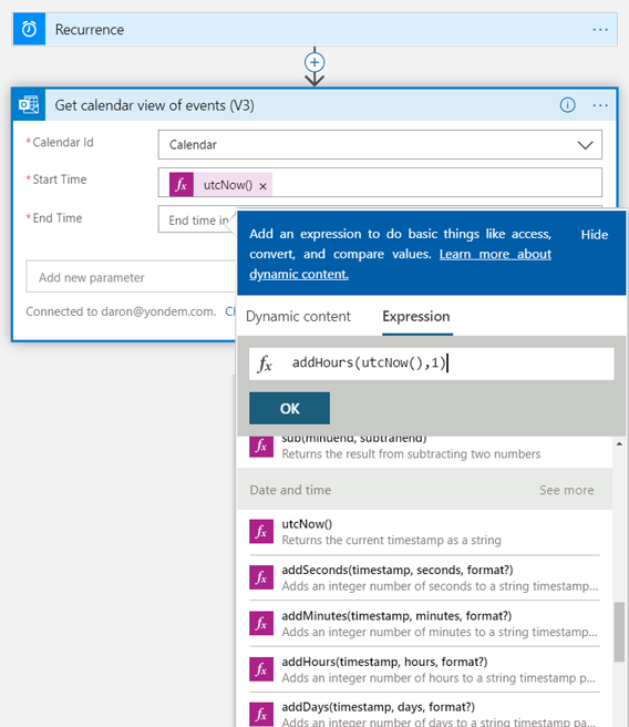I started with a simple Recurrence trigger set to repeat every 5 minutes. When using the Office 365 integration, I fetched the calendar view between now and one hour into the future. This will get us all the events in a JSON array, including all-day events.