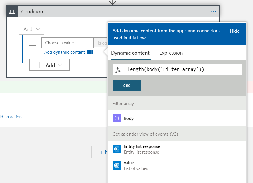 Our final steps if to check if there are any events left in the array at all. I decided to count the items in the array to see if there are any events during the timeframe we queried. We will use a Condition control in Logic Apps and define a dynamic content expression to get the length of the array coming out of the Filtering control.