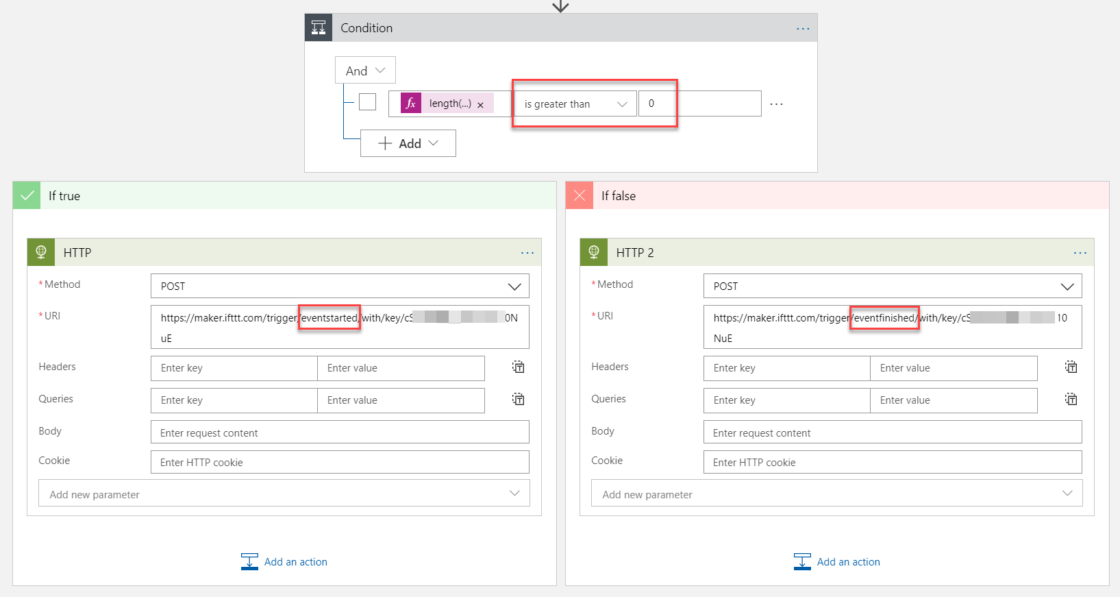 Azure Logic Apps' Office 365 integration has a trigger where you can be notified of a calendar event before the event starts. But there is still the issue of turning the lights off when the event is complete, and multiple conflicting events when you might turn the lights off when another event is already in progress. While looking into what was available in Azure Logic Apps, I noticed that I could get a calendar view of all events between a specific start and end date. That made me think, what if I query the next one hour every five minutes and look if there are any events. If there is, I can turn the light on, if not, turn off. As simple as that. And better! I might be able to implement all that in the Logic App, without a single line of code, no maintenance.