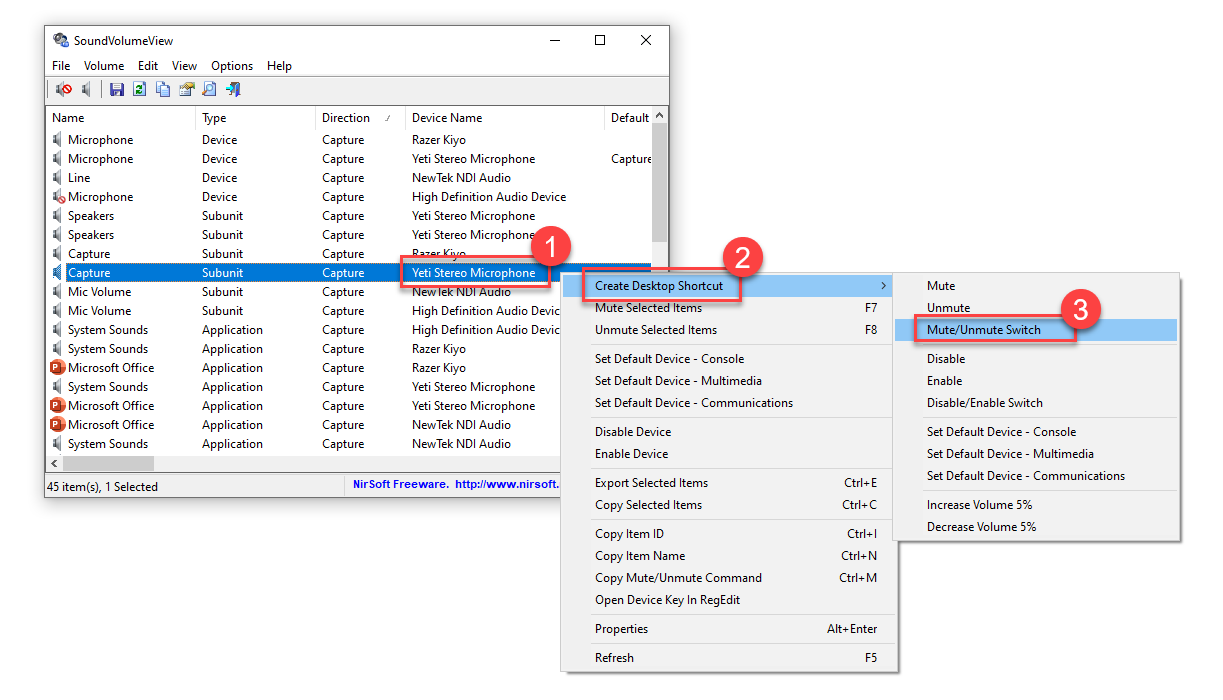 Once you open the app, you can see a list of all audio devices on your machine. In my case, I selected my Yeti Mic and created a shortcut to switch microphone mute on and off. If you look at the details of the shortcut, here is what you will see.