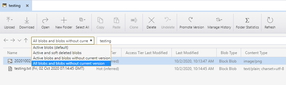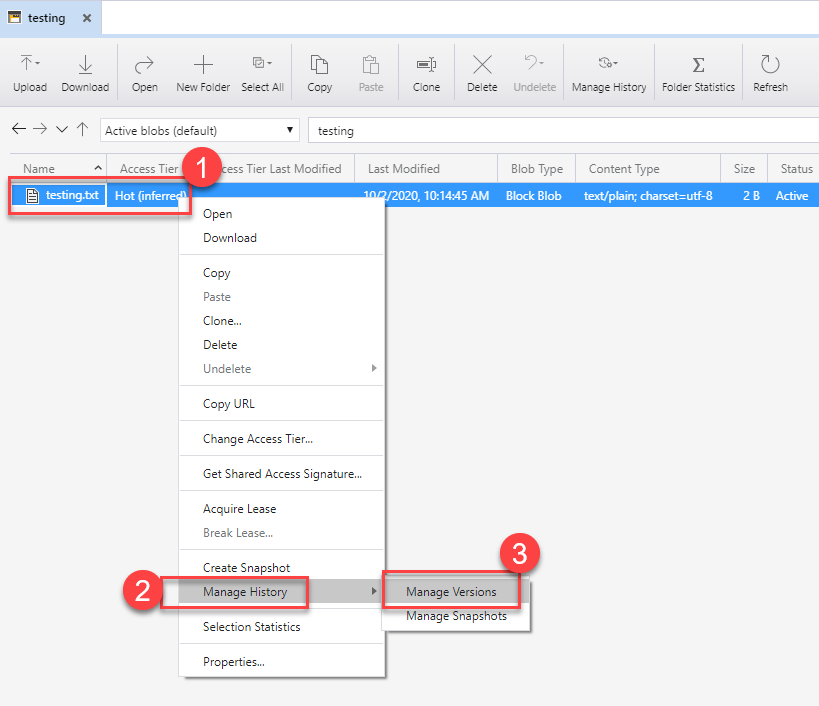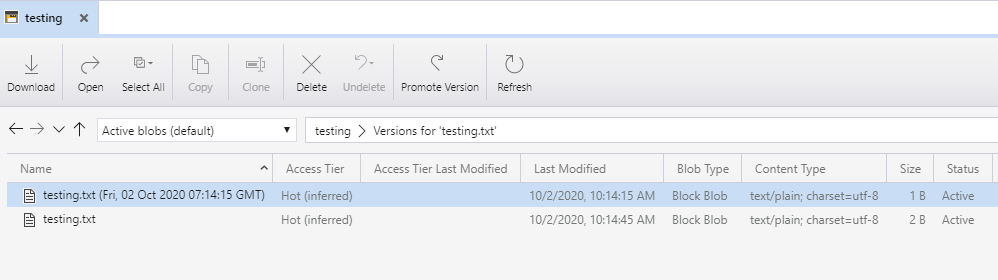 An easy way to test versioning out is Azure Storage Explorer. You can simply upload a text file and upload another one to replace the original. When you right-click on the blob, you can navigate to “Manage Versions” to see all the versions created for the particular blob.