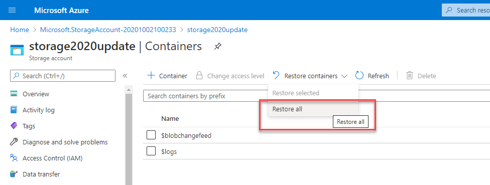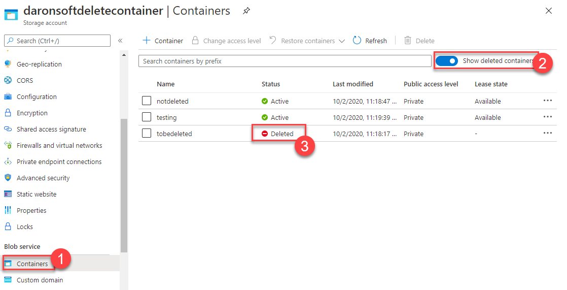 When it comes to containers, things are a little less complicated. Once you have the soft-delete functionality enabled, you can see a list of deleted containers on the Azure portal or through the APIs.