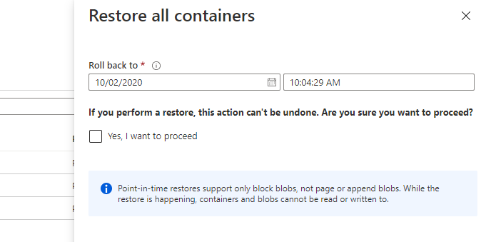 Wait, what? Oh yes. Point-in-Time restores all your block blobs based on any UTC timestamp you provide. You can restore whole containers! There are some prerequisites, though :) You have to have soft delete, change feed, and blob versioning enabled on your storage account. Makes sense, right? It does. Once you have all these functionalities in place, restoring to a point in time is no longer rocket science. In order to restore back in time, you can either call Restore Blob Ranges or go to the Azure Portal.