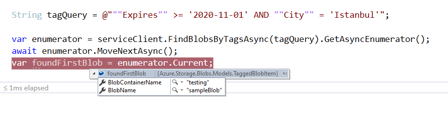 Once you have the tags in place, you can submit your query for various operations. In the example below, I’m merely doing a select and getting just the first blob found. The feature is currently in preview. I strongly suggest you look into its current limitations before going all in.