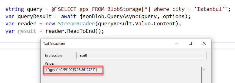 string query = @"SELECT gps FROM BlobStorage[*] where city = 'Istanbul'";