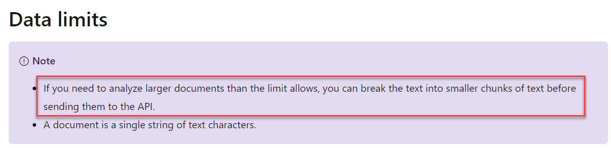 A day ago, I saw Anuraj, a fellow MVP, researching the document size limitations of Azure Text Analytics. If you look at the official documentation, the answer is pretty straightforward, and in some sense, not so helpful.