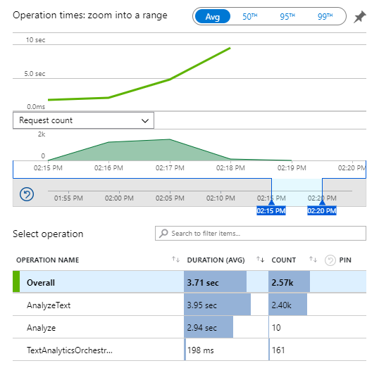 AnalyzeText ran 2.4K times. That’s ok. It looks like we successfully analyzed 2.4K segments. The number is aligned with the number of successful Text Analytics transactions we saw previously. The Analyze function is the HTTP function. It ran ten times. That approves my memory of submitting ten documents as a test. Finally, our Orchestrator ran 161 times. What?