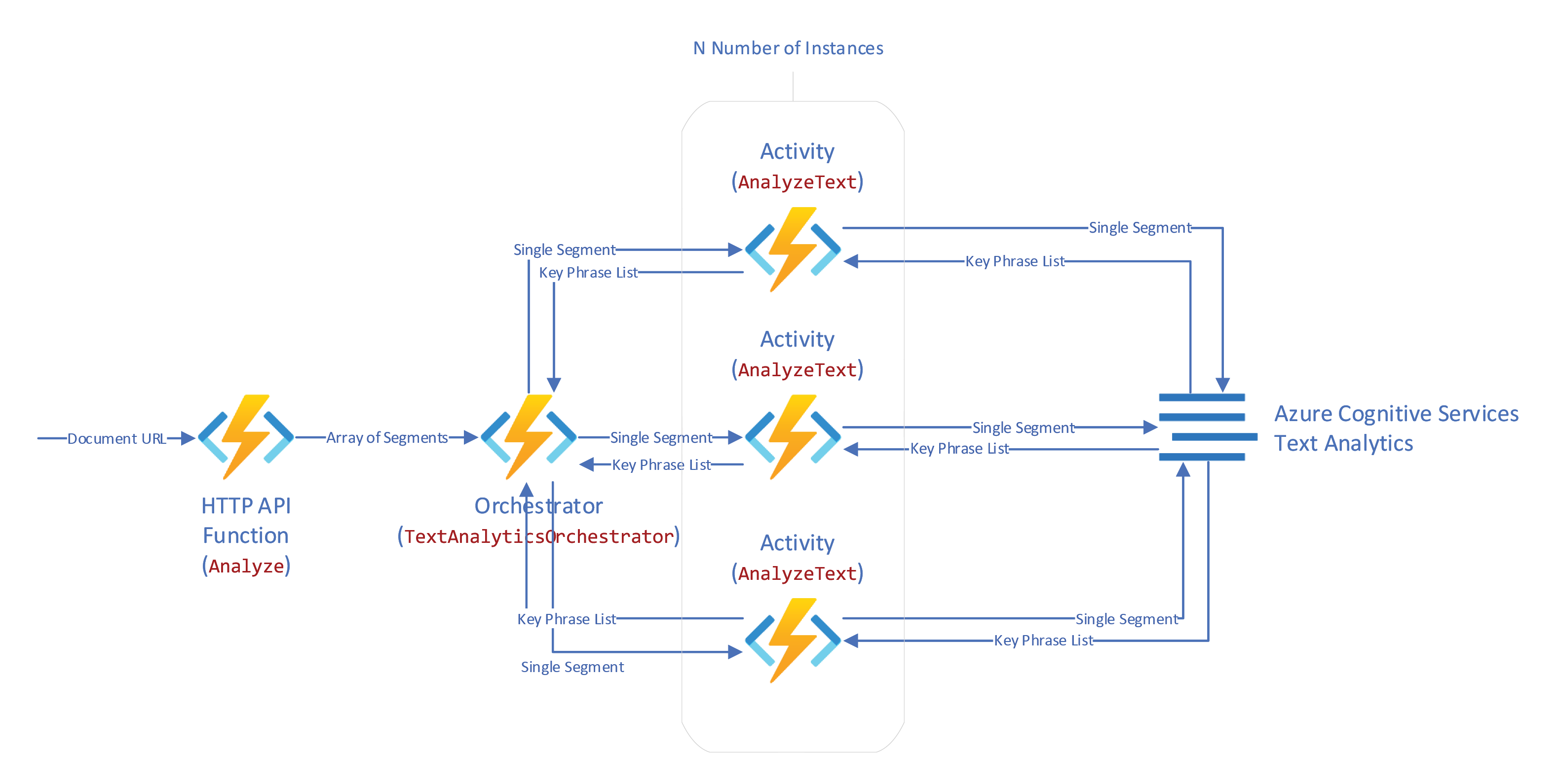 Our AnalyzeText activity does only one thing; it runs the segment through Text Analytics and returns the list of keyphrases. This is the function that will be called thousands of times based on the number of segments you have based on the size of the initial document.